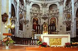 The interior design was largely inspired by the Church of the Gesù in Rome, with some French additions. The lavish decoration, decreed by the Council of Trent (1545-1563), was intended to contrast with the austere churches of the Protestants, with every element intended to elevate the meditation of the faithful. Following the doctrines of the Jesuits, the decoration also contained numerous symbols and sculptures of the Virgin Mary.[9]