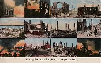 The Saint Augustine Fire destroyed every structure in Saint Augustine, Florida north of the Plaza from Saint George Street to the Bay on the morning of April 2, 1914. The fire claimed six hotels, the opera house, the courthouse, and countless homes and businesses.[1]