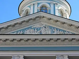 Private stables of Empress Elizabeth of Russia stood on its location in the mid-18th century,[2] until it was granted to Petersburg Armenians on May 2, 1770 by Empress Catherine the Great, upon the request of her Armenian jeweler Ivan Lazarev.[4] Its construction was primarily financed by Lazarev,[2][5] who provided 30,000 rubles of the total 33,000.[6] The church was designed by Yury Felten[4][2] and is an early example of Russian Classicism.[2] Its construction began in the spring of 1771[1] and was completed in 1776.[7] The church was consecrated on February 18, 1780, by Hovsep Arghutian (Prince Argutinsky-Dolgorukov), the archbishop of the Russian diocese of the Armenian church, in the presence of Prince Grigory Potemkin, the favourite of Catherine the Great.[4][3] It is named after Catherine of Alexandria, a namesake of the empress.[8] Colored white and blue, it has a neoclassical portico and single cupola.[9]