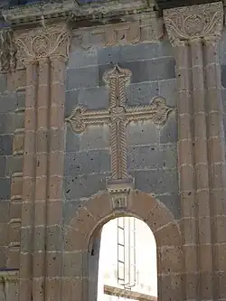 The exterior of Saint Gayane differs from the interior in that it has a cruciform-plan gable roof with the drum and dome placed central to the main structure.