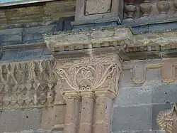 An airy, triple-arched portico was added to the western façade of the church in 1683 as the burial place for prominent Armenian clergymen. The gallery is made up of five distinct yet continuous bays, each being open and linked to the one adjacent. Its three central bays have vaulted ceilings and large arched openings that lead to the exterior courtyard. The two side bays are slightly lower in height and are vaulted as well. Each is surrounded by walls at three sides with small quatrefoil windows placed on the exterior walls. Frescos of clergymen adorn niches along the interior walls of the portico while saints are depicted on the fresco of the tympanum above the main door. Six-columned cupolas sit on the roof above the two end bays and may be seen from the exterior.