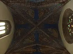 The vault in the presbytery has frescoes called "Czech heaven" finished in 1915 by artist Artuš Scheiner. On the apse vault are visible signs of four evangelists. And in the vault next to the nave are frescoes of cherubs playing on musical instruments. To the presbytery belongs old sacristy and the chapel of Virgin Mary of Vienna. From the outside they are joined as one object and there is no buttress between them. Here is a window with pointed arch and a simple tracery bringing light into the chapel. For lighting up the sacristy there are two windows one with pointed arch and the second one circular. The old sacristy has two fields of the ribbed vault newly built by Kamil Hilbert. By the southern side of the presbytery is located the contemporary sacristy. Light goes inside through couple windows with oblique jambs and tracery. The sacristy has two ribbed cross-vault fields. Ribs there have a wedge profile. Ribs are loaded by canopy corbels. Remains of two frescoes are here and a well-preserved inscription on the wall. Next to the sacristy is a porch, added at the beginning of the 16th century. The porch has a simple late-Gothic portal. The portal was reconstructed in the 20th century, has two masks on the sides by a sculptor Stanislav Sucharda and is finished with a final. In the southern porch was a star rib vault as it was under the white tower, but Kamil Hilbert removed it. Probably the most impressive part of the whole structure is the original southern portal of the presbytery, with its massive pointed arch running deep into the wall. The portal jamb is highly decorated with pear shaped, cylindrical and rectangular profiled shafts. The arch is decorated from the outside with a belt of plastic grapes leaves. In the tympanum above the portal is a sculpture of Ottokar II, made by the sculptor S. Sucharda. From his workshop also came a coat of arms of the Czech kingdom and the town Nymburk, placed on walls in the southern porch.