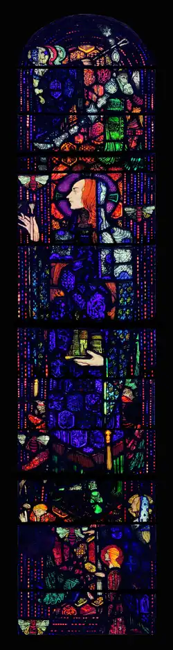 St. Gobnait is shown in profile with a pale, thin and ascetic face and is given individualistic, unmistakable features. She wears royal blue and purple robes adorned with lozenged jewels, a veil and a silver cloak.[10][11] The window's borders are lined with beaded decorations in ruby and blue.[4] Her clothing draws from Léon Bakst's costume for Ida Rubinstein's 1911 performance of "Le Martyre de saint Sébastien".[12] Highly detailed and complex floral patterns run along the outer borders of each of the window's registers.[13]