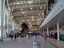 On 6 September 2017, the airport suffered significant damage when Hurricane Irma struck the island as a Category 5 hurricane. Video from a Dutch military helicopter showed the roof had been blown off the terminal, the jetways were damaged, and there was a significant amount of sand (blown through the fences from Simpson Bay Beach) and flooding on the runway.[10] The airport reopened on 10 October 2017 using temporary facilities while repair work commenced.[11] Pavilions were in use during reconstruction of the main terminal. In December 2018, temporary arrival and departure facilities opened within the first level of the terminal building.[12] The entire upper floor of the terminal and the four jet-bridges were out of commission until November 2023. The reconstructed check-in area opened in January 2024. On 15 October 2024 the new arrival hall has been reopened featuring improved baggage handling systems, streamlined immigration and customs processes. Reconstruction of the terminal was completed by Ballast Nedam.[13]