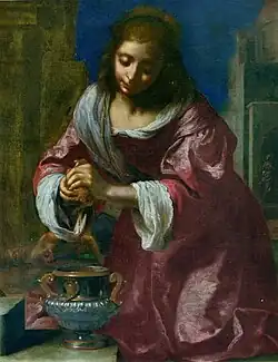 An analysis of the lead white paint, performed by the Rijksmuseum in 2014 in association with the Vrije Universiteit Amsterdam, suggests Dutch or Flemish origin with a strong possibility that the pigment was related to paint used in Vermeer's Diana and Her Companions.[7] The use of a chalk ground is associated with Dutch paintings of this era and the work reflects an unusually extensive use of ultramarine, typical of Vermeer's later work, but not of his earlier paintings, Diana and Her Companions or Christ in the House of Martha and Mary.[7] Wheelock identified stylistic similarities with two history paintings that scholars have confidently attributed to Vermeer. He also noted similarities between the depiction of the saint's face and the figure in Vermeer's A Girl Asleep and argued that the painter's conversion to Catholicism could have given him an interest in the subject matter.[3] Although it is thought unlikely that the Ferrara painting left Italy or that Vermeer visited Italy, Wheelock pointed out that Vermeer had a reputation as an authority on Italian art.[1][3] It is possible that another version or copy of the Ferrara painting was the model for Vermeer's work.[7]