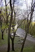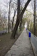 A street which passes through the park's hilly landscape on the eastern side is the cobblestone Saint Volodymyr Descent. At the park's northern end, the Kyiv Funicular[5] serves (mostly for tourists) as a transport connection between Kyiv's Upper Town neighborhood and the historic commercial district of Podil. As an alternative to the funicular, and adjoining it, is a long staircase. Across the funicular tracks to the north a park zone extends onto the Old Kyiv Hill which separates the Upper city (Old Kyiv) from the Lower city (Podil). Ukrainian House is located near the park's southern border by the Three Saints Street (vulytsia Tryokhsvyatytelska). In the same vicinity is located the Institute of Philosophy.