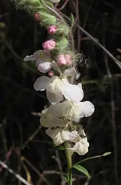 The top of the mostly naked stem is occupied by a raceme inflorescence of white snapdragon flowers, which are often tinted with lavender or pink, especially when newly opened. Each flower is about a centimeter wide.