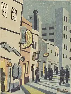 He was a founding member of the Nippon Hanga Kyokai (Japan Print Association) in 1931. He worked for the Han magazine alongside Hiratsuka Un'ichi, Azechi Umetarō and Munakata Shikō. He contributed thirteen prints to the series Shin Tokyo Hyakkei ("One Hundred Views of New Tokyo") which was produced from 1928 to 1932.[1] He took part in the painting events at the 1932 and 1936 Olympic Games.[2] From 1936 he designed woodblock-printed covers for books.[1]
