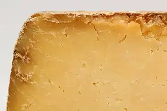 Salers (French pronunciation: [salɛʁ]; Auvergnat: Salèrn) is a French semi-hard cheese originating from Salers, department of Cantal, in the volcanic mountains of the Massif Central, Auvergne, central France.[1] It is a pressed, uncooked cheese, sometimes made from Salers cow's milk (it's then called "Tradition Salers"), between 15 April and 15 November.[1] It is circular in shape, formed in rounds weighing around 40 kilograms (88 lb).[1] The cheese is aged in caves at temperatures ranging from 6–12 °C (43–54 °F) for a minimum of 3 months, and up to 45 months.[1]