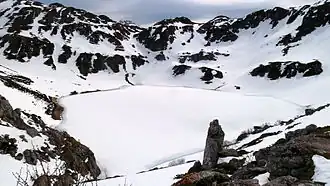 Saliencia Lakes are a conjoined group of post-glacial lakes in Somiedo, Asturias, Spain. They are situated in the Somiedo Natural Park and are composed of the following: Calabazosa (or Black Lake), Cerveriz, Almagrera Lagoon (or La Mina), and Lago de la Cueva. Lago del Valle, at 5,085 feet (1,550 m) above sea level, is the largest in the group and is the principality's largest lake.[1] Fauna in the lake valley includes the presence of Eurasian brown bear, Otter, Egyptian vulture and Golden eagle. The majority of amphibians inside the park are found by these lakes, including Alpine newt, Palmate newt, Fire salamander, common toad, Common midwife toad, Common frog, and the Iberian frog. The lakes are protected space within the World Network of Biosphere Reserves of Somiedo Natural Park, declared a natural monument on 22 May 2003. Myth has it that the lakes are guarded by xanas (fairy princesses).[2]