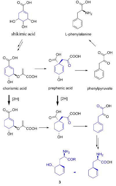 Proposed biosynthesis of the nonproteinogenic amino-acid beta-hydroxycyclohex-2'-enylanine (3) (R = H or S~PCP) via a shunt in the phenylalanine biosynthetic pathway