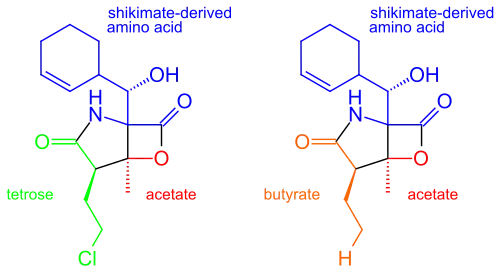 While they share the biosynthetic precursors acetate and presumed β-hydroxycyclohex-2'-enylalanine (3), they differ in the origin of the four-carbon building block that gives rise to their structural differences involving the halogen atom. A hybrid polyketide synthase-nonribosomal peptide synthetase (PKS-NRPS) pathway is most likely the biosynthetic mechanism in which acetyl-CoA and butyrate-derived ethylmalonyl-CoA condense to yield the β-ketothioester (4), which then reacts with (3) to generate the linear precursor (5).