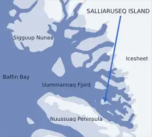 Salliaruseq Island (old spelling: Sagdliaruseq, Danish: Storøen, translated: The-big-island) is an uninhabited[1] island in Avannaata municipality[2] in northwestern Greenland. At 130 km2 (50.2 sq mi),[1] it is one of the larger islands in the Uummannaq Fjord system, located in its central part due east of Uummannaq Island. [3]