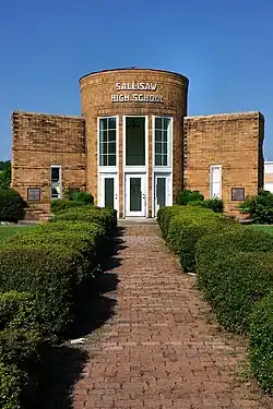 Work began on a three-story brick high school in 1908, but not in time for the first graduating class of Sallisaw High School held in a Methodist church that same year.[2]