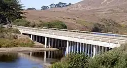 At least seven bridges span Salmon Creek. The newest and longest of these is the State Route 1 bridge, which is 200 feet (61 m) long and was built in 1983. Freestone Flat Road crosses on a steel truss 103 feet (31 m) long which was built in 1955, making it the oldest of the seven. Bodega Highway crosses in two places: 0.9 miles (1.4 km) from State Route 1 on a bridge 92 feet (28 m) long built in 1962 and at Valley Ford-Freestone Road on a 76 ft (23 m) bridge built in 1968. Salmon Creek Road spans the creek on a 78 ft (24 m) bridge dating from 1958, Bohemian Highway crosses on a 70 ft (21 m) bridge from 1971, and Scouts Camp Road crosses on a 57 ft (17 m) structure from 1960.[11]