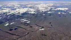 Spread across approximately 2,103 square miles (5,450 km2) with 871 square miles (2,260 km2) in the state of Idaho, the Salmon Falls Creek basin drains portions of Elko County in Nevada and Owyhee and Twin Falls County in Idaho. Much of the southern portion of the watershed is part of the Basin and Range Province of northern Nevada, while the lower watershed is characterized by the basalt plateau of the Snake River Plain.[6] As a whole, the entire Salmon Falls Creek watershed is very arid. Much of the basin receives less than 10 inches (25 cm) of rain annually, while the mountainous areas may get up to 30 inches (76 cm). Rainfall in the mountains provides most of the perennial flow into Salmon Falls Creek Reservoir, while springs from the Snake River Aquifer also provide some water.[7]