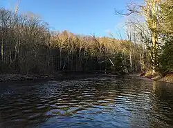 The Salmon River is formed at the confluence of the Blackledge and Jeremy rivers about one mile west of North Westchester, Connecticut. It drains 96,000 acres[1] and courses for 10.4 miles (16.7 km)[2] to Salmon Cove near Moodus where it flows into the Connecticut River. The Salmon River is probably the largest stream and watershed whose sources and mouth are entirely within the limits of Connecticut.[3]