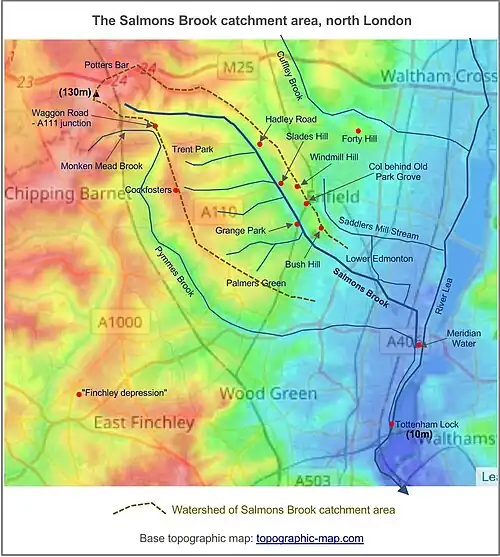 - ^ Elsewhere, the railway line between Enfield Chase and Grange Park stations crosses from the east side of the watershed between Salmons Brook and Saddlers Mill Stream to the west side at a col at an altitude of about 40 metres, just behind Old Park Grove. Windmill Hill lies to the north of this col at c60 metres altitude, Bush Hill lies to the south at c50 metres, and the two watercourses on either side are at about 30 metres. This topographical configuration invites speculation that the col is also a wind gap, in this case marking a former line of Salmons Brook, when it may once have flowed eastwards to the Lea across this "wind gap" and then along today's line of Saddlers Mill Stream. The brook would later have been diverted to its present course by stream capture. However, in this case the col could equally have come about through other causes, such as spring sapping on one or both sides. So the stream capture hypothesis currently remains in the realm of speculation only.