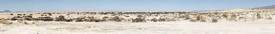 Just outside the community, there is a dry salt pan called Salt Flat Playa or Salt Basin. It straddles the New Mexico-Texas border and is approximately 150 miles long, and five to 15 miles wide, making it one of the largest gypsum playas in the United States. The playa occupies the north-south oriented Salt Basin Grabben, which lies between the Guadalupe and Delaware Mountains on the east and the Sierra Diablo and Diablo Plateau on the west. The playa was originally a lake during the late Pleistocene epoch, but drying of the climate since then has left a salt pan.[4] Today, a briny water table is about three feet below the surface. Capillary evaporation in the dry, hot weather pulls brine upwards and evaporite (gypsum, halite) and carbonate (calcite, dolomite) minerals precipitate.[4] Cyanobacteria (blue-green algae) grow on the surface and immediately below the surface when the playa is wet. Alternating light and dark bands are either gypsum-rich (light) or dolomite-rich (dark)[5] When the playa is dry during the summer, winds blow the gypsum into sand dunes.