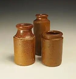 In the UK during the 17th century and 18th century, high quality salt-glazed stoneware was produced in Derbyshire, Nottinghamshire, London and Staffordshire.[12] Salt glazed pottery was also popular in North America from the early 17th century until the early 19th century,[13] indeed it was the dominant domestic pottery there during the 19th century.[14] Whilst its manufacture in America increased from the earliest dated production, the 1720s in Yorktown, significant amounts were imported from Britain until around the mid-19th century.[15]