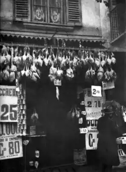The salumeria originated in Italy and dates to the Middle Ages.[1][7] Historically, salumerie in Bologna, Italy, did not produce their own meats.[1] They selected meats and other products such as pasta, olives and cheeses from local purveyors.[1] These purveyors worked in a guild system that was created by the signori in Bologna, the city's rulers, in a system that dates to the Middle Ages.[1] Purveyors for salumeria products included the salaroli, which controlled the salt industry, who salted the pork, which was then shipped to the lardaioli, a guild that sold the pork.[1] The lardaioli also produced soap and candles from the pork lard they would receive.[1] This guild system was eliminated by Napoléon Bonaparte around the time of the turn of the 19th century.[1]