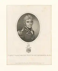 Salusbury Pryce Humphreys was born at Clungunford Rectory, Shropshire, on 24 November 1778, the third son of Reverend Evan Humphreys and his wife Mary.[1][2] He entered the navy on 1 July 1790, during the Spanish Armament, serving as a volunteer aboard the 64-gun HMS Ardent, which was then under the command of Captain James Vashon. He was next aboard the 50-gun HMS Trusty, the flagship of Rear Admiral Sir John Laforey in the Leeward Islands, followed by a posting to the 32-gun HMS Solebay, commanded by Captain Matthew Squire.[1][2] He was rated as able seaman during this last posting, after which he was moved to the 14-gun HMS Fairy, commanded by Captain Francis Laforey. His next ship was the 50-gun HMS Severn, under Captain Paul Minchin, where he was rated as midshipman some time before the outbreak of war with Revolutionary France in February 1793.[1] Severn conveyed the Governor General of Canada, Lord Dorchester, and his family and suite, to Quebec, returning to Britain in 1794.[2] Humphreys followed Minchin to his next command, the 38-gun HMS Hebe, and went out to the West Indies. While serving there, Humphreys was ordered to act as lieutenant of the 14-gun HMS Fury under Captain Henry Evans in April 1796.[1][2]