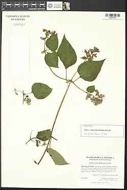 Salvia coriana is a perennial plant that is endemic to tropical cloud forest in Guatemala, growing at approximately 2,000 m (6,600 ft) elevation on the northwestern slopes of Pico Zunil in the Sierra Chuatroj range.[1]
