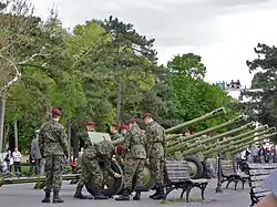 A salvo is the simultaneous discharge of artillery or firearms including the firing of guns either to hit a target or to perform a salute.[1] As a tactic in warfare, the intent is to cripple an enemy in many blows at once and prevent them from fighting back.