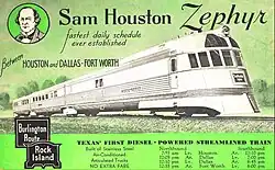 The Sam Houston Zephyr was a named passenger train operated by the Burlington-Rock Island Railroad, a subsidiary of both the Chicago, Burlington and Quincy Railroad and the Chicago, Rock Island and Pacific Railroad. It was the first streamlined passenger train in Texas.[1]
