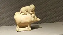 The Samnites would use a fenced off 200 square feet area that was covered in linen cloth to sacrifice animals such as pigs, sheep, goats, birds, cows, fish, roe deer, and oysters.[3][10] In the beginning of the 5th century BCE, they began to use votive offerings. Such as votive bronze figurines, terracotta figurines, pottery, coins, beverages, cakes, animal statuettes, and weapons taken from their defeated enemies.[11][12] These gifts needed to be important to the populace, and they could entice the gods to aid the offeror.[3][13][14]