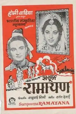 Sampoorna Ramayana (transl. The Complete Ramayana) is a 1961 Indian Hindi-language Hindu mythological film directed by Babubhai Mistry, based on the Hindu epic Ramayana by Valmiki, starring Mahipal and Anita Guha as Rama and Sita respectively. The film was a box office hit,[1] and became a milestone in the history of Hindu mythology.[2] It was the second significant Hindi film based on Rama, after Vijay Bhatt's hugely popular Ram Rajya (1943). Babubhai, known for his special effects throughout his career, made extensive use of effects to enhance dramatics.[3] The film also made lead actor Anita Guha, who played the role of Sita, a household name. Lata Mangeshkar sang two of the most top-class semi-classical songs in this movie, namely "San Sanan, Sanan, Sanana, Ja Re O Pawan" and "Badalon Barso Nayan Ki Or Se", which are still very popular.[4]