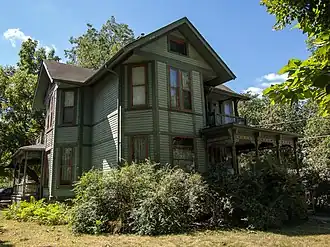 The Samuel A. and Margaret Stevenson House is a historic building located in Des Moines, Iowa, United States. This is the best preserved example of the residential architecture that combines the Stick and Eastlake styles in the city.[2] In the suburban areas of the city in the late 19th century this was one of the most common residential styles. Most of them have been either demolished, significantly altered, or lost most of their character by being covered over with siding. The Stevensons bought the property in 1889 from the Vermont Syndicate, who developed Kingman Place. They mortgaged the property for $2,687.50 to the syndicate immediately after they bought it, probably for them to build their house for them from a pattern book or stock plan design.[2] The two-story wood-frame structure features exterior walls of painted clapboards, vertical and horizontal trim boards, and capped with a crossgabled roof. The house was listed on the National Register of Historic Places in 1985.[1]