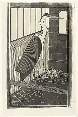 Over the next years, de Mesquita principally devoted himself to art, experimenting with various techniques and mediums. Though known primarily for his wood engravings, he also produced etchings, lithographs, watercolors and drawings; his applied art consisted mostly of material designs. There are birds, exotic animals, plants and flowers, and fantastical representations, both humorous and grim. Among de Mesquita's most beautiful works are his portraits, particularly his self-portraits.[2][3]