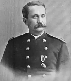 On 1 July 1860, Cushing was appointed a second lieutenant of Infantry by brevet and assigned to frontier duty in New Mexico Territory.[4] He served at Fort Defiance in 1860 and 1861, including participation in an extended expedition during the Navajo Wars.[4] During part of 1861, he served in Santa Fe, where he and Albert J. Myer studied and experimented with signaling and communications methods including the telegraph and wigwag flags and lanterns.[4][5] He received his commission as a second lieutenant in the 2nd Infantry Regiment on 19 January 1861.[4] At the outbreak of the American Civil War in the spring of 1861, Cushing served initially with the army garrison that defended New York Harbor.[4] He received promotion to first lieutenant on 14 May 1861.[4]