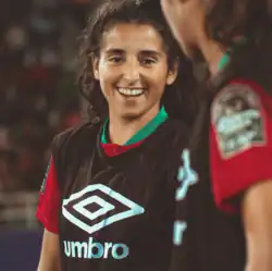 Hassani made her senior debut for Morocco on 14 June 2021 in a 3–2 friendly home win over Mali.[2] She scored her first goal for Morocco in a 2–0 against Senegal on 30 November 2021.[21] She notched her first international brace in a win over Congo on 11 June 2022.[22]