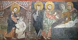 The next miracle, the Marriage at Cana, takes up half the space on the left on the west wall. The composition is disrupted by a doorway and is sectioned by a column. Jesus, the bridegroom and bride are seated at the feast. The table is shown covered with a white cloth and has circular loaves of bread and bowls of fruit. Jesus, at the left, is holding a knife in his left hand and blesses with his right hand. As in the previous scene, Jesus is depicted with nimbus and dark red hair and beard, and is dressed in a long red tunic and dark blue mantle. The bearded bridegroom, who is holding a knife in his right hand and lifts his left hand in a gesture of speech, wears a tall hat, pale green tunic with an orange lining, brown mantle, light brown hose, and red sandals. The bride, who is seated at the right, is dressed in an orange headdress, a pale green robe with wide sleeves, and raises her right hand with her palm turned outward.[4]
