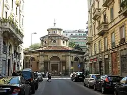 The Lazzaretto of Milan was a quadrangle with 400 yard long sides, designed by Lazzaro Palazzi in the late 15th century. It was located outside the city walls and Porta Orientale. In the center an altar had been placed in the open ground. After the Lazzaretto was used for housing the ill during the plague epidemic of 1576, the archbishop Carlo Borromeo commissioned a new church from Pellegrino Tibaldi. Construction from 1558 to 1592, erected this centralized church with open circumferential arches which allowed the ill to see services from all corners of the surrounding porticos.[1][2] After the French occupation of the Duchy, the lazzaretto was used as barracks. During the Cisalpine Republic, the architect Giuseppe Piermarini was commissioned to transform the church into a secular Temple of the Nation (Tempio della Patria). Piermarini Demolished the cupola, and walled the sides, but reconstruction soon ceased. During the 19th century, the central fields of the Lazzaretto were used for agriculture, and the surrounding cloister was used by peasants. In the late 19th century, the Lazaretto buildings were nearly entirely demolished, and the church was reconsecrated by 1884, with a new dome and an added facade portico.