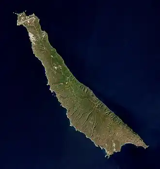 San Clemente Island (Tongva: Kinkipar; Spanish: Isla de San Clemente)[1] is the southernmost of the Channel Islands of California. It is owned and operated by the United States Navy,[2] and is a part of Los Angeles County. It is administered by Naval Base Coronado. It is 21 miles (34 km) long[3] and has 147.13 km2 (56.81 sq mi) of land. The 2018 census estimates 148 military and civilian personnel reside on the island.[4] The city of San Clemente in Orange County, California, is named after the island.