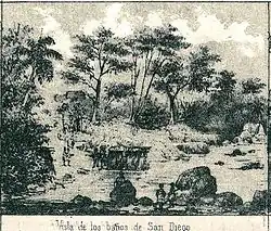 In 1850 the first stone of the present day's church was laid[8] for a town that already had 120 houses, of which 51 were masonry, and a fixed contingent of 137 inhabitants, not counting vacationers or seasonal bathers.[7] In 1853 the Overseas Minister issued a communication informing that the Queen had approved the free transport, medical assistance and maintenance for the poor; from then on several thousand patients came annually to San Diego's baths.[8] The town hall was built by royal order in 1866.[8] The first permanent natural bath was installed in 1891,[5] the same year as the creation of the charge of Director Médico de las Aguas Minero-Medicinales de Cuba; Dr. Manuel Sabas Castellanos y Arango was the first to hold that charge.[8] The first balneotherapy centre was built towards the middle of the 19th century (?), with 8 artificial pools and 24 bath tubs.[5]