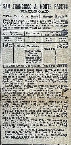 San Francisco and North Pacific Railroad (SF&NP) provided the first extensive standard gauge rail service to Sonoma County and became the southern end of the regional Northwestern Pacific Railroad. Although first conceived of by Asbury Harpending, who had even obtained many of the right of ways, the SF&NP was bought and subsequently constructed by Peter Donahue, who drove the first spike on August 30, 1869.[1]