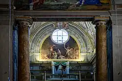 In the two false niches flanking the main altar are two monochrome figures representing Science and Religion (1772). The altar 1746 was designed by the architect Nicola Salvi. The yellow veined marble frontal with green and red border displays the symbol of the Confraternity in its centre.