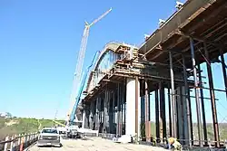 By February 2019, crews were working over the San Joaquin River and making final preparations before placing concrete at the east archway of the viaduct. The concrete placement was while crews continued forming up the west archway and building an additional scaffold. These arches act as a suspension bridge support for the bridge span over the river.[6] The bridge was deemed completed in May 2021.[7]