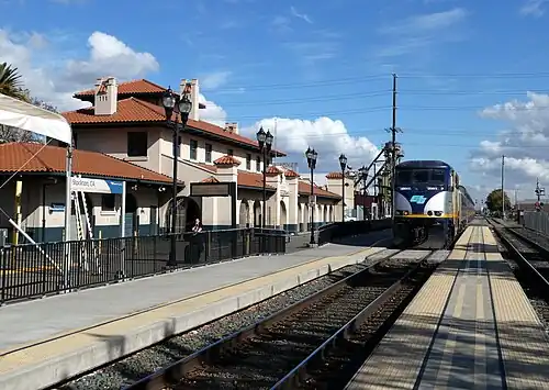 San Joaquin Street station, also known as Stockton – San Joaquin Street, is an Amtrak station in Stockton, California. Originally built for the Atchison, Topeka and Santa Fe Railway (which acquired the San Francisco and San Joaquin Valley Railroad), it is a stop for trains on Amtrak's San Joaquin line between Oakland and Bakersfield. The Mission Revival style building cost $24,470 to construct (equivalent to $736,933 in 2023), and includes typical design features such as stuccoed walls, a red tile roof and shady arcades.[3]