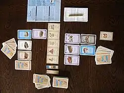 The cards, each of which depict a building and describe its ability, serve multiple purposes: A card in a player's hand is, at the same time, both money used for building, and a potential building to be built. Additionally, the cards are used to represent goods produced in any Production building.