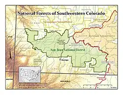 The San Juan National Forest is a U.S. national forest covering over 1,878,846 acres (2,935.7 sq mi, or 7,603.42 km²) in western Colorado. The forest occupies land in Archuleta, Conejos, Dolores, Hinsdale, La Plata, Mineral, Montezuma, Rio Grande, San Miguel and San Juan Counties.[1] It borders the Uncompahgre National Forest to the north and the Rio Grande National Forest to the east. The forest covers most of the southern portion of the San Juan Mountains west of the Continental Divide. The forest contains two alpine wilderness areas; the Weminuche and South San Juan, as well as the Piedra Area. The Durango and Silverton Narrow Gauge Railroad passes through the National Forest.