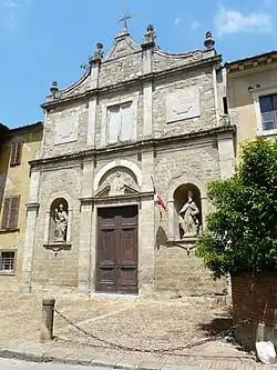 A church was initially established by Guiscard, Marquis of Tuscany in 1005, and part of the building we see today dates to the 12th century. In 1507, Bishop consecrated a reconstruction,[1] but the church sports today a later Baroque facade with statues in tufa of Santi Lino and Giusto by Leonardo Ricciarelli.