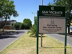 Named in honor of the 14th century Dominican friar Saint Vincent Ferrer, the site was first settled as an Indian Reduction in 1618 by Spanish conquistadores and was initially known as Laguna de la Reducción. Luis Pessoa y Figueroa, a landowner from Magdalena and member of the Buenos Aires Cabildo, bought much of the land south of the San Vicente Lagoon (then known as Laguna del Ojo) in 1696, and his son, Juan Bautista Pessoa, established a small settlement in 1734. A fort, Fortín El Zajón, was built here by the Blandengues cavalry corps in 1750. Luis Pessoa's grandson, Friar Vicente Pessoa, established the area's first Catholic parish in 1781 and on 30 December 1784, the county of Magdalena was formally divided into among two other towns, San Vicente.[1]