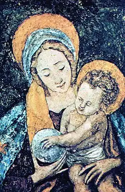 On the Via Aemilia between San Vito and Santa Giustina is a seventeenth-century Marian shrine, the Sanctuary of Madonna di Casale, locally renowned for its Virgin and Child fresco.[20] The fresco was painted in 1593 by Baldassarre Pasolini from Longiano, and measured 130 centimetres (51 inches) by 110 centimetres (43 inches). In June 1596, the first miracle was attributed to the fresco: Sebastiano del Duro returned home from unjust imprisonment after his wife, Caterina, was advised by a visiting pilgrim to light a candle by the sanctuary.[21] An abbey church was erected by the shrine in 1602, with six side-chapels.[22]