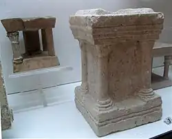 Worshippers offered the sanctuary steles, altars, or statues according to their social status. The construction was offered by the entire community according to the Neo-Punic dedication found.[C 3] The main center of cult life was the courtyard, which also contained the earliest statues.[B 7] The site's arrangement and the statues' placement during the Punic period, when the two shrines were built, remains uncertain. One hypothesis suggests that the site was globally arranged in one phase, while another proposes that the statues were placed progressively according to the generosity of the worshippers.[B 6]