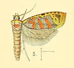 The wingspan is about 10 mm. The costal and apical portions of the forewings are orange, the extreme costal margin dotted irregularly throughout with leaden grey. There is a large reniform leaden grey spot before the apex, not reaching the costa, but attenuated downwards to the apical margin above the anal angle, as well as a large leaden grey patch extending from the base nearly to the anal angle, occupying three-fourths of the width of the wing, and approaching the costa at its upper and outer angle at two-thirds from the base, its upper and outer edges irregularly sinuous and clearly defined, the outer edge somewhat transverse and oblique. This leaden patch contains three transverse bright vermilion bars, not reaching to its upper edge, and a spot of the same colour. The first bar near the base touching the dorsal margin is angulated outwards on the fold, the second bar tends a little obliquely inwards from the middle of the dorsal margin and is attenuated at a point a little above the fold. The third bar starts erect from the dorsal margin and is dilated and bent a little inwards at half its length. Between the first and second bar, and almost touching the orange costal border, lies a nearly circular spot containing a few black scales before its upper edge, which is narrowly margined with orange. The hindwings are brownish fuscous.[3]